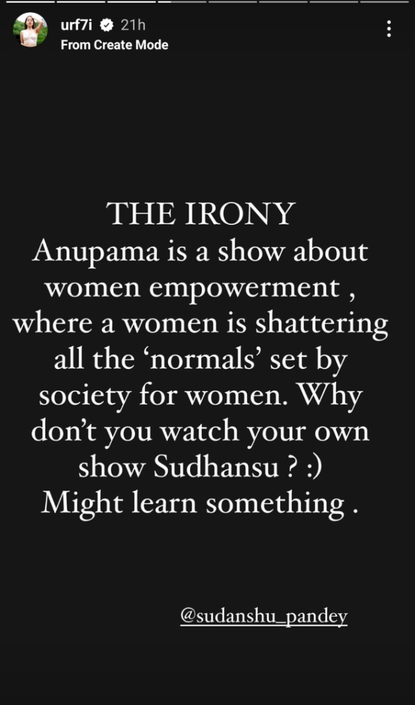 बाद में, उर्फी ने एक और पोस्ट किया और लिखा, “विडंबना। अनुपमा महिला सशक्तिकरण के बारे में एक शो है, जहां एक महिला महिलाओं के लिए समाज द्वारा निर्धारित सभी ‘मानदंडों’ को तोड़ रही है। आप अपना खुद का शो सुधांशु क्यों नहीं देखते? हो सकता है कुछ सीखो।”