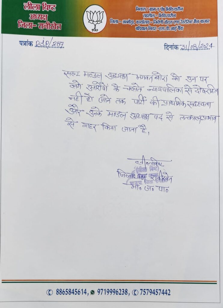 इसी बीच अल्मोड़ा जिले के सल्ट में बीजेपी के मंडल अध्यक्ष भगवत बोरा पर नाबालिग से छेड़खानी का आरोप लगा है. इसके बाद राजस्व पुलिस ने रेगुलर पुलिस को इसकी जांच सौंपी हैं. साथ ही पार्टी जिला अध्यक्ष ने मंडल अध्यक्ष भागवत बोहरा को निष्काषित भी कर दिया हैं.