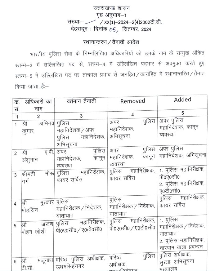 जारी आदेश के मुताबिक जीपी अभिनव कुमार को अपर पुलिस महानिदेशक कानून व्यवस्था की, अंशुमन को अपर पुलिस महानिदेशक अभी सूचना की जिम्मेदारी दी गई है। इसके अलावा नीरू गर्ग को पुलिस महानिरीक्षक पीएसी, मुख्तार मोहसिन को पुलिस महानिरीक्षक फायर सर्विस और अरुण मोहन जोशी को पुलिस महानिरीक्षक निदेशक यातायात की जिम्मेदारी के साथ ही चार धाम यात्रा प्रबंधन की भी जिम्मेदारी दी गई। इसके अलावा कई और अधिकारियों का तबादला किया गया है।