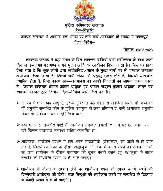 पुलिश कमिश्नरेट लखनऊ द्वारा जारी प्रेस नोट में कहा गया कि लखनऊ जनपद में बड़ा मंगल के दिन लखनऊ वासियों द्वारा हर्षोल्लास के साथ उक्त दिन जगह-जगह पर भण्डारा एवं पूजन आदि का आयोजन किया जाता है। जिस पर प्रायः देखा गया है कि कुछ लोगों द्वारा सार्वजनिक / शहर के मुख्य मार्गों पर भी पण्डाल लगाकर आयोजन किया जाता है, जिसमें भारी संख्या में श्रद्वालु एकत्र होते हैं, जिससे यातायात प्रभावित होता है, जिस कारण आम जनमानस को काफी दिक्कतों का सामना करना पड़ता है। जिसके दृष्टिगत श्रीमान पुलिस आयुक्त एवं श्रीमान संयुक्त पुलिस आयुक्त कानून एवं व्यवस्था महोदय द्वारा विभिन्न दिशा-निर्देश जारी किये गये हैं।