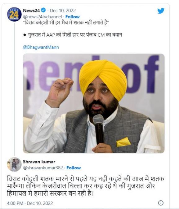 कोहली पर सीएम मान के बयान को देखकर विराट के प्रशंसक सक्रिय हो गए और भगवंत मान को ट्रोल करना शुरू कर दिया। एक यूजर ने कहा, ‘विराट कोहली ने आज शतक लगाया है।’ इसके अलावा लोगों ने इस बात को लेकर भी भगवंत पर निशाना साधा कि केजरीवाल गुजरात चुनाव में उनकी जीत की भविष्यवाणी कर रहे थे।