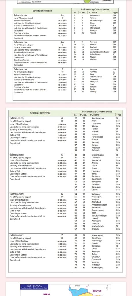 19 अप्रैल को रामपुर, बिजनौर, मुरादाबाद, पीलीभीत में वोटिंग होगी। वाराणसी में 1 जून को वोटिंग होनी है। लखनऊ में 20 मई को वोटिंग होगी। 26 अप्रैल को अमरोहा, मेरठ, बागपत, गाजियाबाद, गौतमबुद्धनगर, बुलंदशहर, अलीगढ़, मथुरा में मतदान होगा।