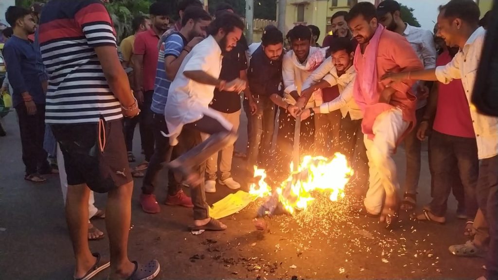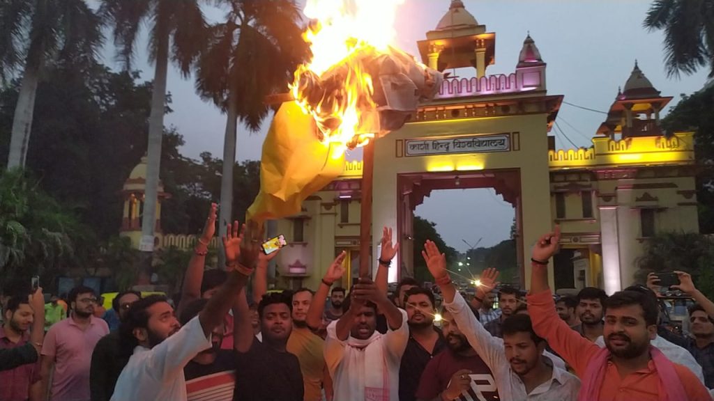 मामला NTA के द्वारा करवाए जाने वाले संयुक्त शोध परीक्षा को चार विश्वविद्यालयों में अंग्रेजी भाषा ( English Language) में परीक्षा करवाए जाने के नोटिफिकेशन को लेकर छात्रों में आक्रोश का माहौल है। छात्रों ने इस नोटिफिकेशन को हिंदी भाषा का अपमान और हिंदी भाषीय विद्यार्थियों ( Hindi Language Students) के अनदेखी का आरोप लगाकर विरोध – प्रदर्शन किया। काशी हिंदू विश्वविद्यालय के छात्रों ने विरोध स्वरूप प्रतिकार मार्च निकालकर UGC चेयरमैन के साथ विश्वविद्यालयों के कुलपति (Vice chancellor ) का पुतला फूंका है।