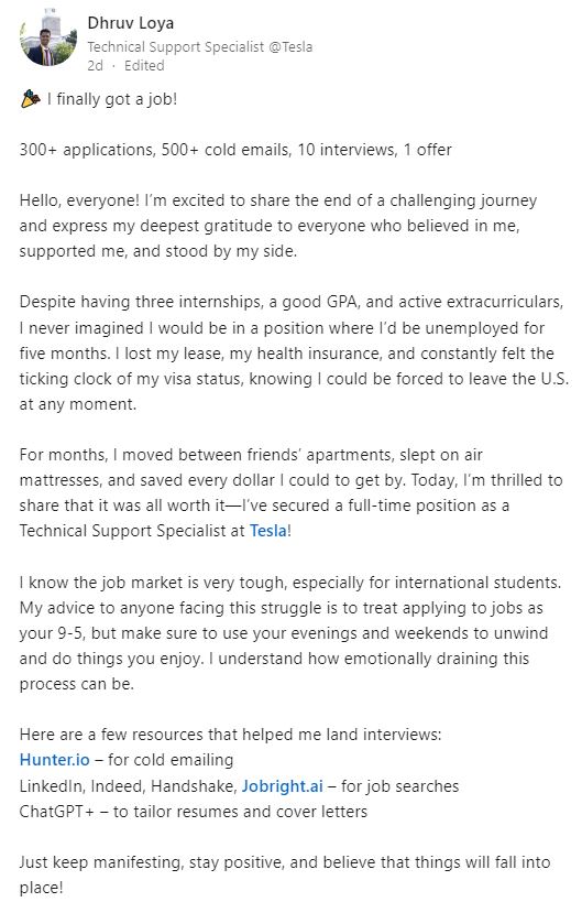 भारतीय मूल के एक इंजीनियर ने टेस्ला के लिए एक जॉब इंटरव्यू में सफलता प्राप्त की, जिसमें 300 से अधिक आवेदक प्रतिस्पर्धा कर रहे थे। न्यूयॉर्क में रहने वाले ध्रुव लोया ने लिंक्डइन पर पोस्ट करके खुलासा किया कि उन्होंने “300 से अधिक आवेदन, 500 से अधिक कोल्ड ईमेल, 10 इंटरव्यू, 1 ऑफर” के बाद टेस्ला में तकनीकी सहायता विशेषज्ञ का पूर्णकालिक पद हासिल किया है।