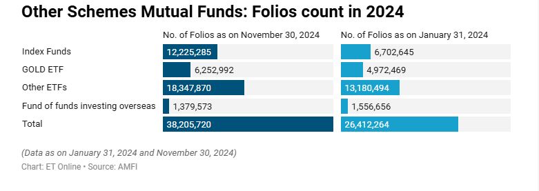 अन्य योजनाएं, जिनमें इंडेक्स फंड, गोल्ड ईटीएफ, अन्य ईटीएफ और विदेशी फंडों में निवेश करने वाले फंड शामिल हैं, ने 2024 में 1.17 करोड़ फोलियो जोड़े, जिससे नवंबर में फोलियो की कुल संख्या 3.82 करोड़ हो गई, जो जनवरी में 2.64 करोड़ थी। इस श्रेणी में लगभग 106 नई योजनाएँ जोड़ी गईं। इंडेक्स फंड्स ने नवंबर में 55.22 लाख फोलियो जोड़े, नवंबर में कुल फोलियो संख्या 1.22 करोड़ थी। अन्य ईटीएफ ने 2024 में 51.67 लाख फोलियो जोड़े, इसके बाद गोल्ड ईटीएफ ने विज्ञापन दिया..