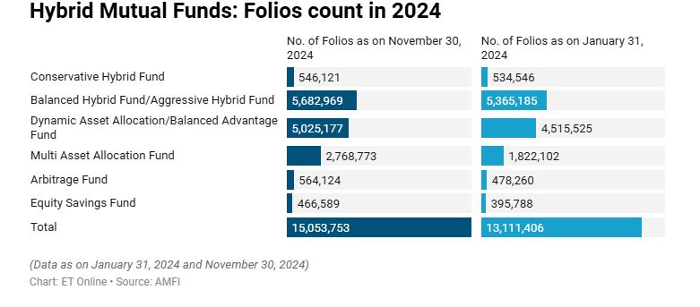 हाइब्रिड म्यूचुअल फंड ने 2024 में 19.42 लाख फोलियो जोड़े। नवंबर 2024 तक कुल फोलियो की संख्या 1.50 करोड़ थी, जो जनवरी में 1.31 करोड़ थी। इस श्रेणी में लगभग 11 नई योजनाएं शुरू की गईं। छह हाइब्रिड श्रेणियों के बीच, मल्टी एसेट एलोकेशन फंड ने 2024 में 27.68 लाख की कुल फोलियो संख्या के साथ 9.46 लाख फोलियो जोड़े। डायनेमिक एसेट एलोकेशन/बैलेंस्ड एडवांटेज फंड्स ने 2024 में 5.09 लाख फोलियो जोड़े, इसके बाद एग्रेसिव हाइब्रिड फंड्स आए, जो विज्ञापन देते हैं।