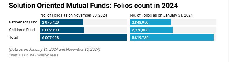 सॉल्यूशन ओरिएंटेड म्यूचुअल फंड ने 2024 में 1.87 लाख फोलियो जोड़े, जबकि जनवरी में 58.19 लाख फोलियो के मुकाबले नवंबर में कुल फोलियो संख्या 60.07 लाख फोलियो थी। दो श्रेणियों में से, सेवानिवृत्ति फंड ने 2024 में 1.26 लाख फोलियो जोड़े, इसके बाद बच्चों के फंड ने समान समय अवधि में 61,364 फोलियो जोड़े।