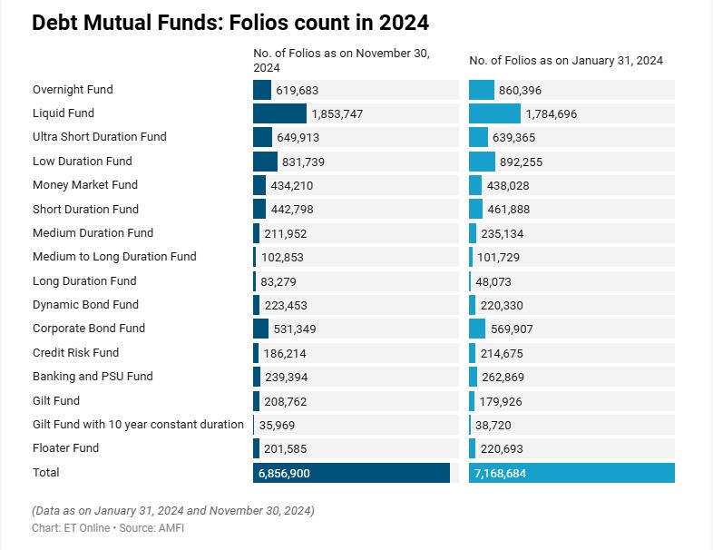 16 डेट म्यूचुअल फंड श्रेणियों में से, ओवरनाइट फंडों में 2024 में फोलियो में सबसे अधिक 2.40 लाख की गिरावट देखी गई, नवंबर में कुल फोलियो संख्या 6.19 लाख थी, जबकि जनवरी में यह 8.60 लाख थी।